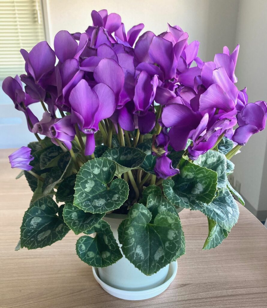 休暇明けに元気に咲き続けているシクラメンに再会できた時はホッとしました。(KS)