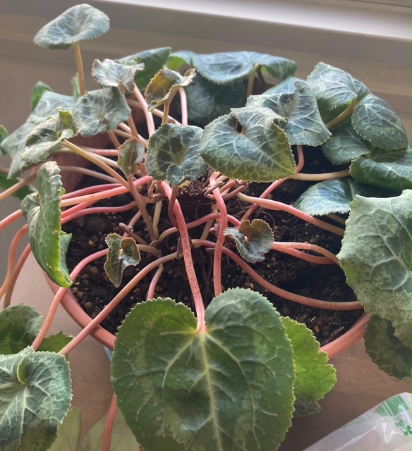 昨年末にお客様からいただいたシクラメンの鉢を、水やりを減らして夏越しさせました。11月中に一回り大きな植木鉢に植え替えて肥料も与えたところ、小さな葉がたくさん生えてきましたが、花芽を付ける気配は一向にありません。いったい何が気に入らなかったのでしょうか…。今や単なる観葉植物と化していますが、シクラメンは二度目の花を咲かせるのがとても難しい植物なのだと勉強になりました。(KS)